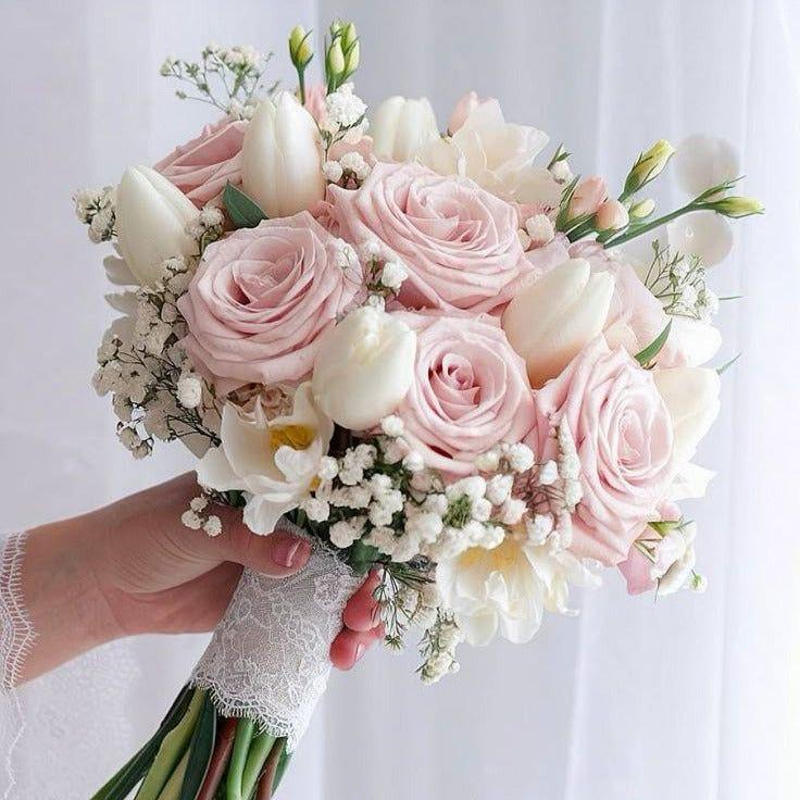 The Blush Rose & White Tulip Bridal Bouquet is delicate and elegant. Blush roses pair with crisp white tulips to symbolize love and purity.